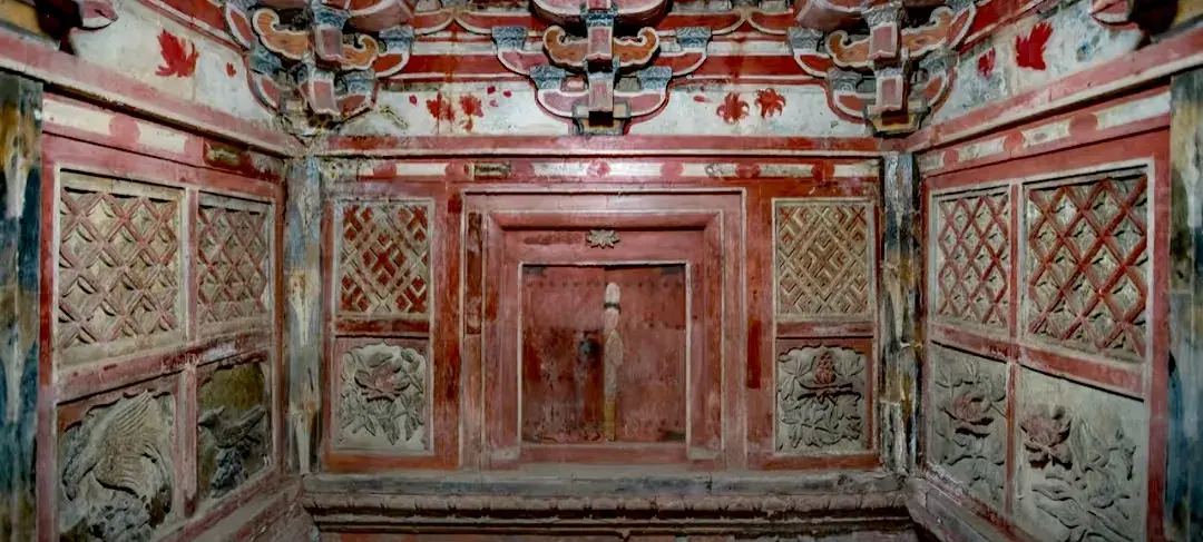 On both sides of the tomb chamber are brick-carved wooden doors. The upper sections feature dense, double-layered patterns, while the middle and lower panels are filled with elaborate floral designs. The craftsmen even carved nail holes and wood grain into the doorframes and joints. Although made entirely of brick, the doors appear almost indistinguishable from real wooden ones.