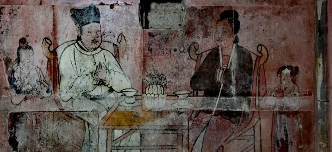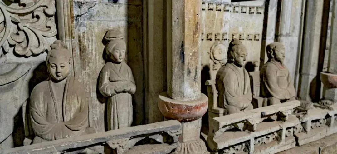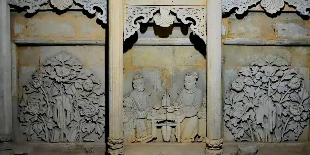 The tomb complex was used by four generations of the same family, spanning different periods and artistic styles. The earliest generation, the family founders, are depicted sitting in a single-story house, drinking tea and eating pastries—relaxed and content, like ordinary people enjoying their own courtyard.