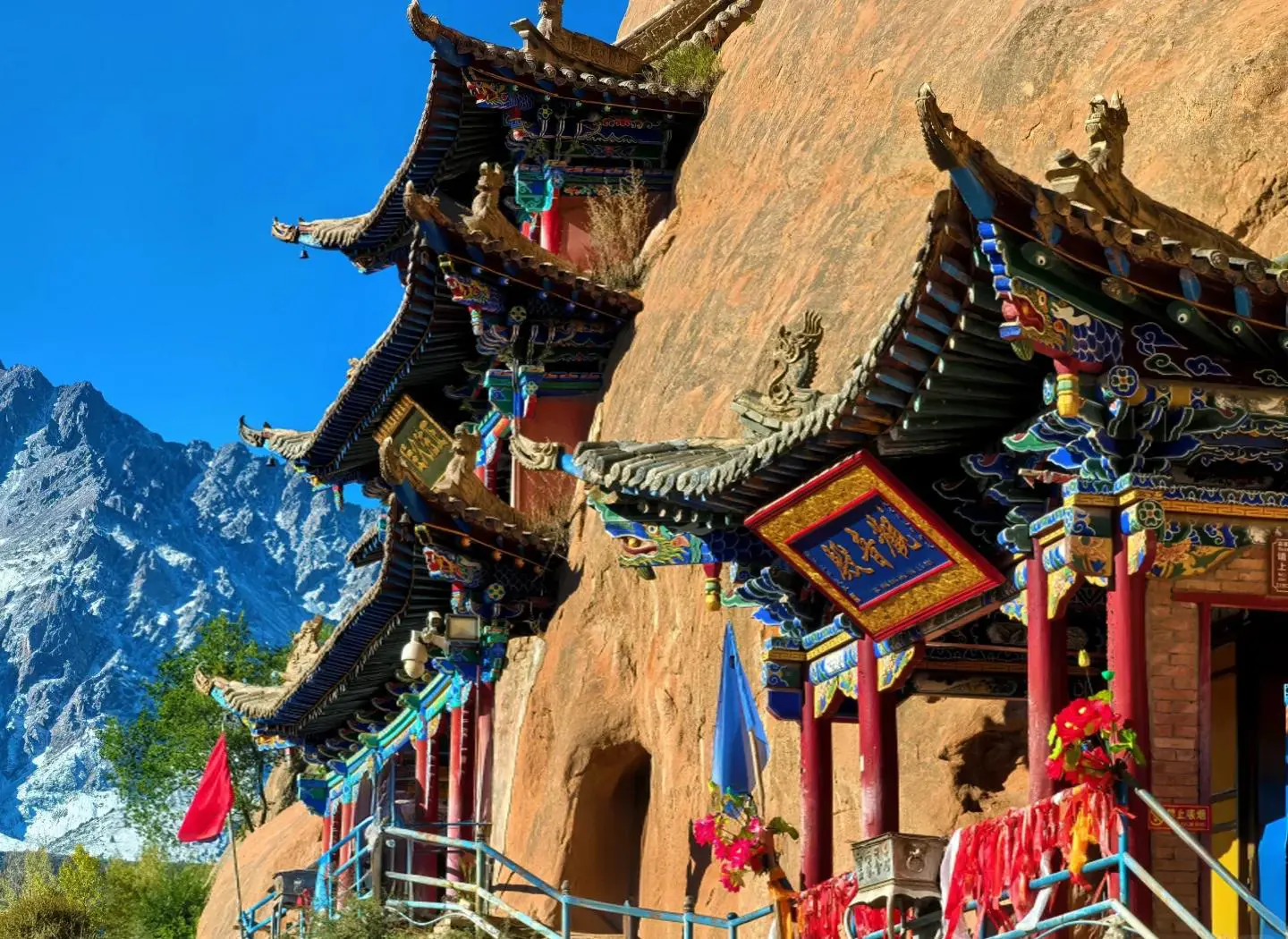 🏛️ Historical Development: Mati Temple was founded during the Northern Liang period of the Sixteen Kingdoms/Eastern Jin era. It began as a Han Chinese Buddhist monastery and gradually developed into a Tibetan Buddhist temple. Guo Yu, a Jin-era figure, once retreated here to live in rock caves, teach, and lead disciples in carving the grottoes; across successive dynasties the Mati grotto complex took shape as a collective work of art.