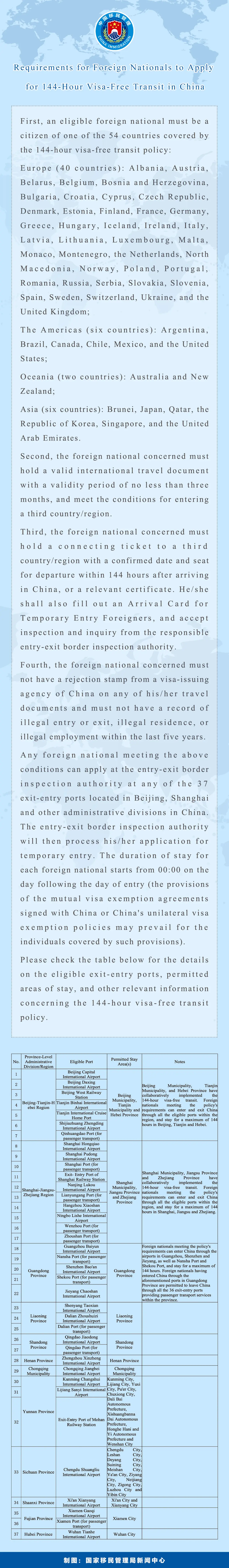 Any foreign tourist group consisting of two or more individuals, which is organized and received by a travel agency registered in China, may enter China without a visa by a cruise ship via one of the cruise ports in the following 13 cities: Beihai (Guangxi Zhuang Autonomous Region), Dalian (Liaoning Province), Guangzhou (Guangdong Province), Haikou (Hainan Province), Lianyungang (Jiangsu Province), Qingdao (Shandong Province), Sanya (Hainan Province), Shanghai, Shenzhen (Guangdong Province), Tianjin, Wenzhou (Zhejiang Province), Xiamen (Fujian Province) and Zhoushan (Zhejiang Province). All eligible foreign tourist groups shall continue their journey to the following scheduled ports and depart China with the same cruise ship as scheduled. The tourists concerned may stay in the Beijing and 11 coastal provinces, autonomous regions, and municipalities directly under the Central Government (namely Fujian, Guangdong, Guangxi, Hainan, Hebei, Jiangsu, Liaoning, Shandong, Shanghai, Tianjin, and Zhejiang) for a maximum of 15 days.